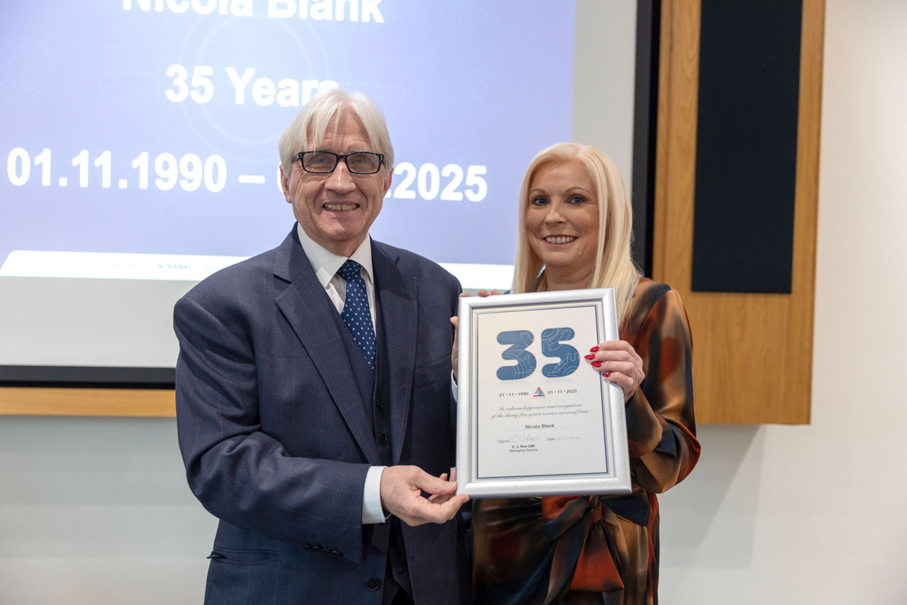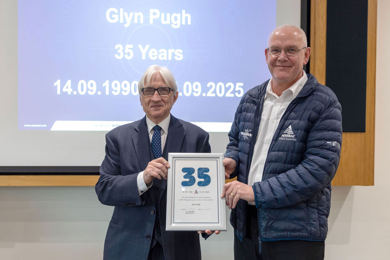 International seal repair manager Glyn Pugh and accounts team leader Nicola Blank were rewarded for 35 years with AESSEAL.