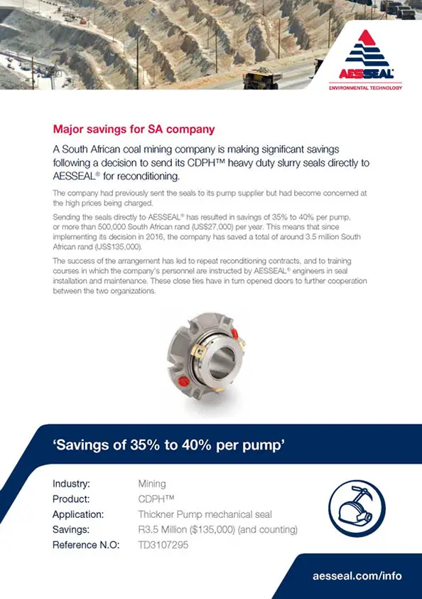 A South African coal mining company is making significant savings following a decision to send its CDPH heavy duty slurry seals directly to AESSEAL for reconditioning.