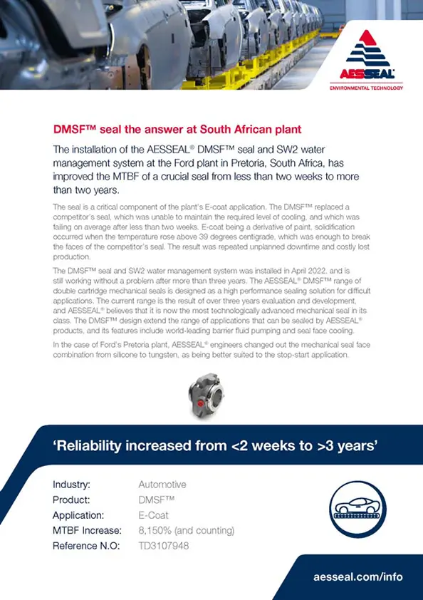 The installation of the AESSEAL DMSF seal and SW2 water management system at the Ford plant in Pretoria, South Africa, has improved the MTBF of a crucial seal from less than two weeks to more than two years.