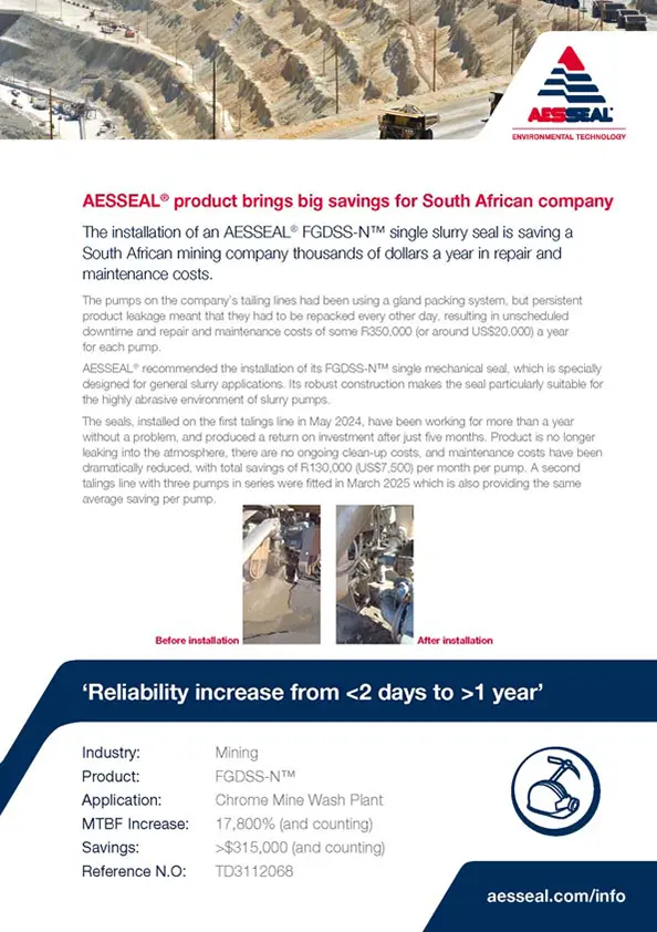 The installation of an AESSEAL FGDSS-N single slurry seal is saving a South African mining company thousands of dollars a year in repair and maintenance costs.