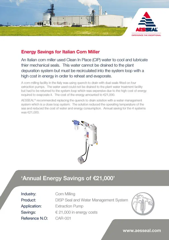 An Italian corn miller used Clean In Place (CIP) water to cool and lubricate thier mechanical seals. This water cannot be drained to the plant depuration system but must be recirculated into the system loop with a high cost in energy in order to reheat and evaporate.