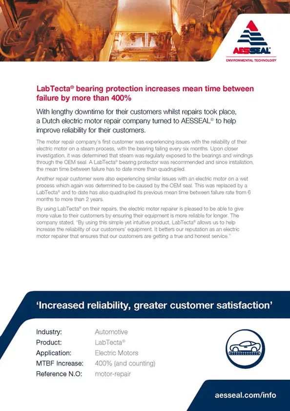 The LabTecta®MG (Flush Mount Electric Motor Design) range of products are intended for use as a bearing protection device on electric motors which require flush mounted bearing isolators due to limited outboard space. This design is also available with a VFD (variable frequency drive) Grounding Ring installed to prevent premature bearing failure due to electrical fluting caused by the stray currents created when using VFD motor controllers.