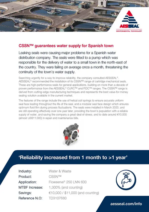 The AESSEAL® CSS™ & CSSN™ range of cartridge mechanical seals has been designed as high-performance sealing solutions for general applications. These products build on over a decade of proven performance from the AESSEAL® CURC™ and FIDC™ range of seals. They combine this with cutting-edge manufacturing techniques to represent the best value-for-money sealing solutions available today.