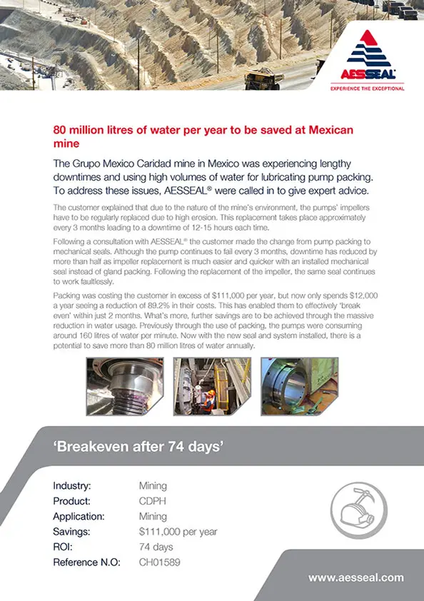 The Grupo Mexico Caridad mine in Mexico was experiencing lengthy downtimes and using high volumes of water for lubricating pump packing. To address these issues, AESSEAL® were called in to give expert advice.