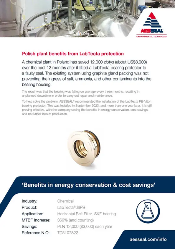 A chemical plant in Poland has saved 12,000 złotys (about US$3,000) over the past 12 months after it fitted a LabTecta bearing protector to a faulty seal.