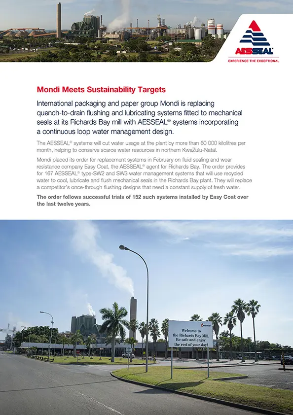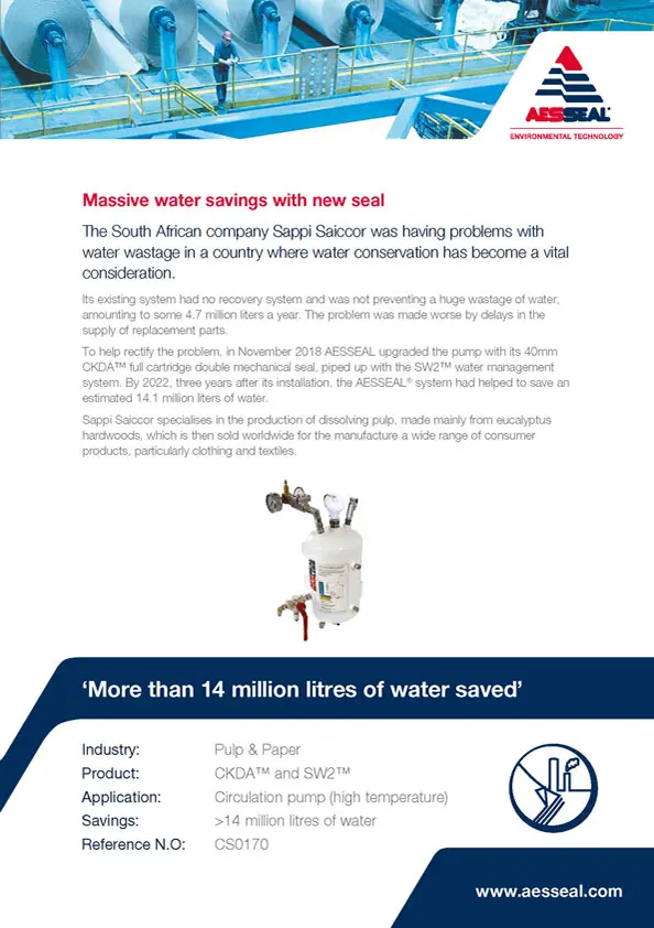 A South African pulp and paper company is saving almost 18,000 litres of water a month following the installation of the AESSEAL DISP seal and SW02 water management system.