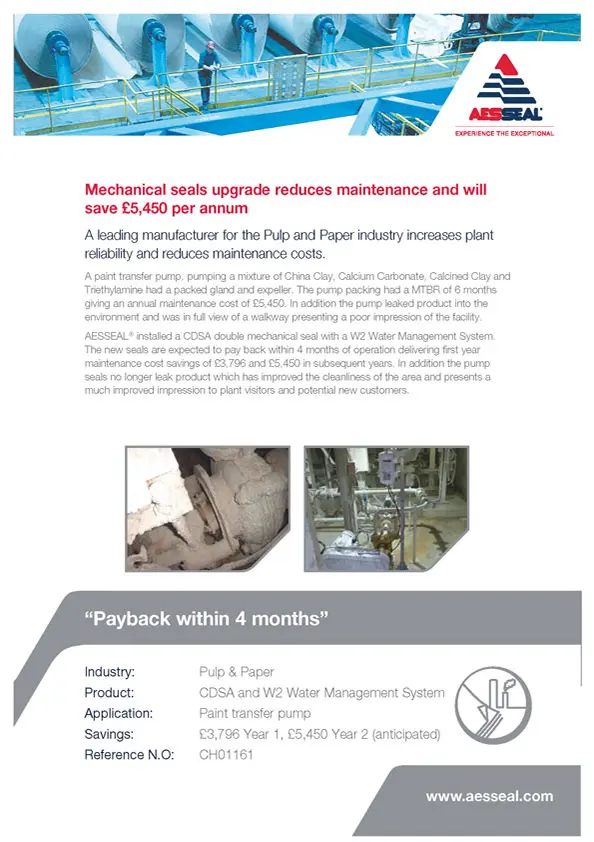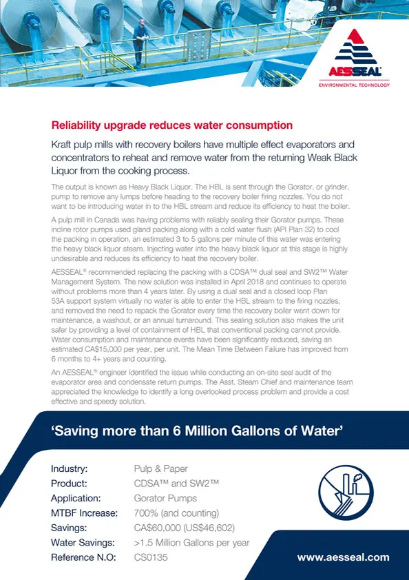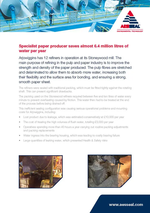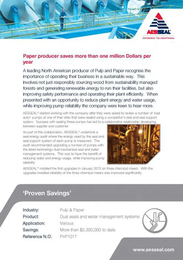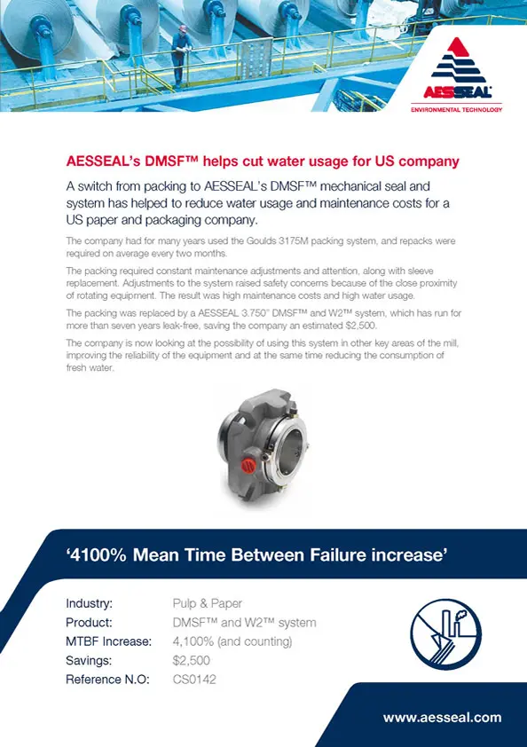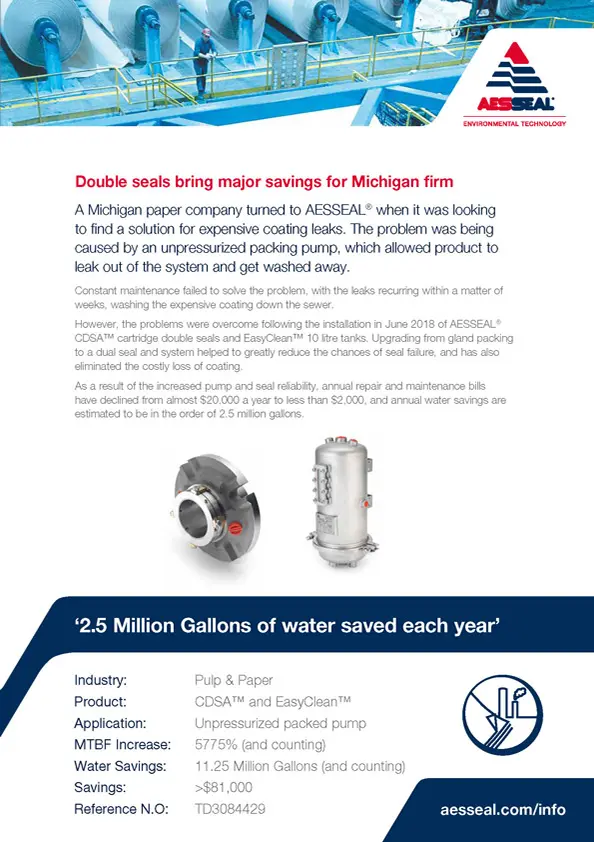 A US paper company has saved $1.5 million over the past seven years after replacing inefficient gland packing on two of its pumps with the AESSEAL CDSA double mechanical seal and tank systems.