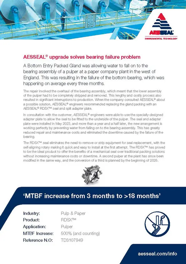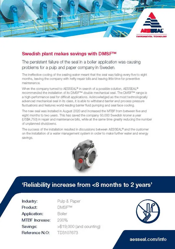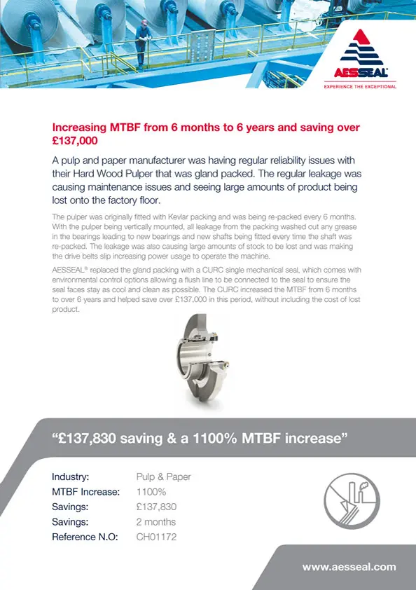 The installation of an AESSEAL® DMSF™ seal at a Japanese paper plant has increased the MTBF from just six months to seven years.