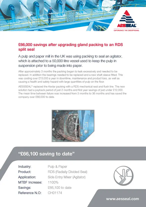A pulp and paper company has saved almost £20,000 following the installation of an AESSEAL DVS sealing compound system.