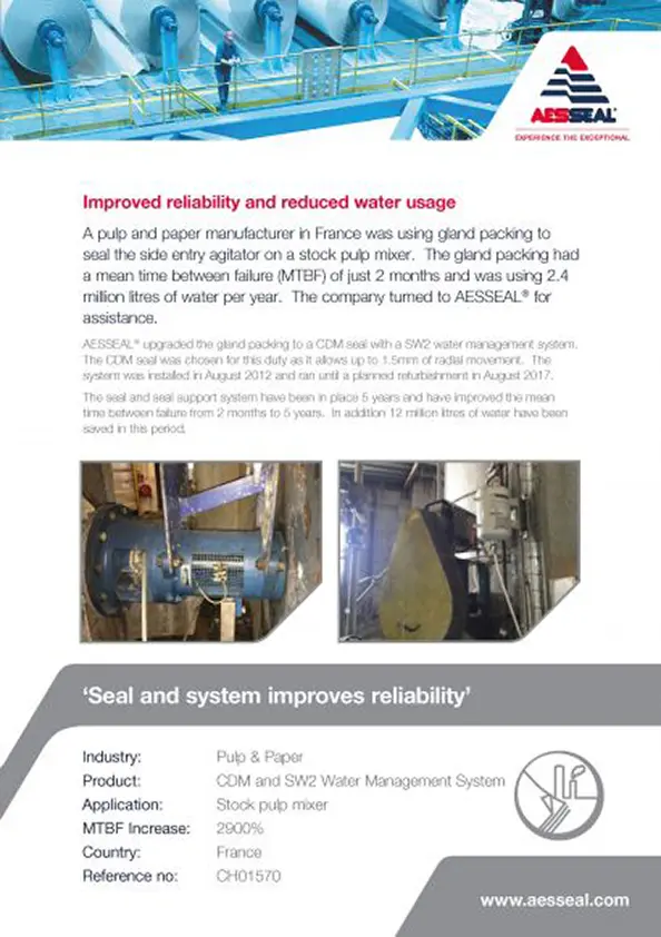 A pulp and paper manufacturer in France was using gland packing to seal the side entry agitator on a stock pulp mixer. The gland packing had a mean time between failure (MTBF) of just 2 months and was using 2.4 million litres of water per year.