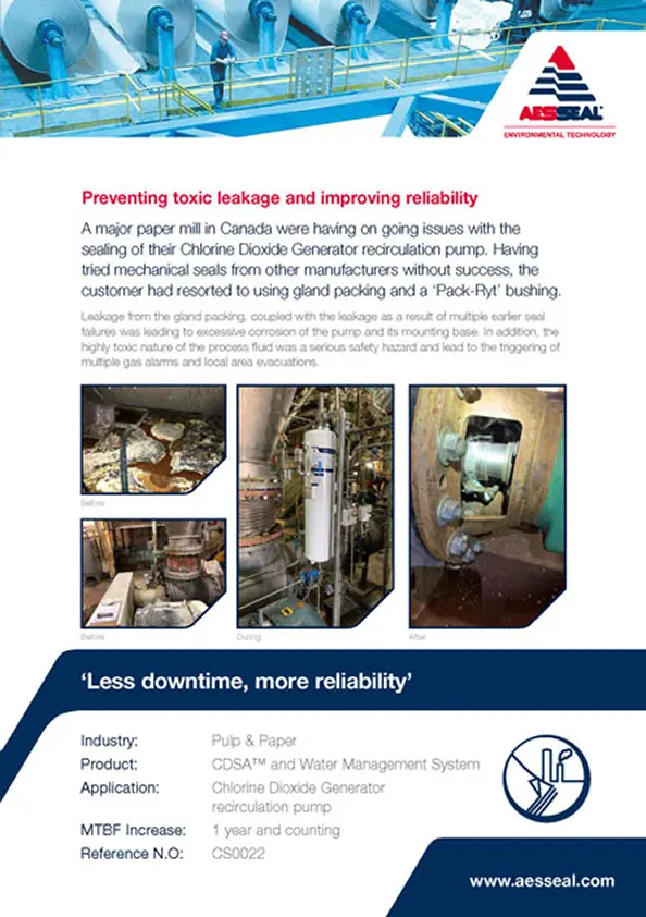 A pulp & paper company in the Canada were dissatisfied with the reliability of the mechanical seal used in its Chlorine Dioxide generator pump.