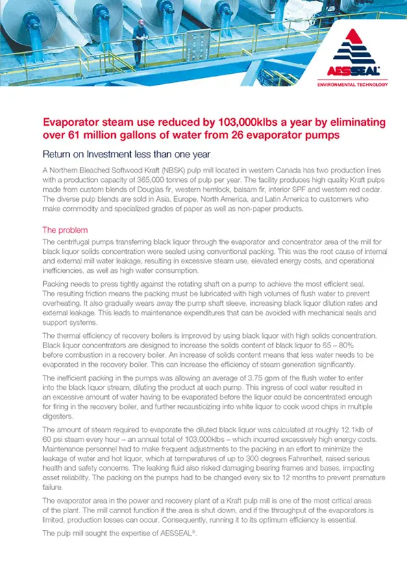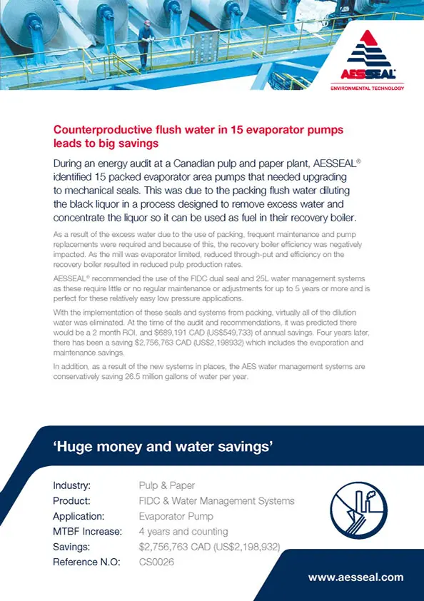During an energy audit at a Canadian pulp and paper plant, AESSEAL identified 15 packed evaporator area pumps that needed upgrading to mechanical seals.