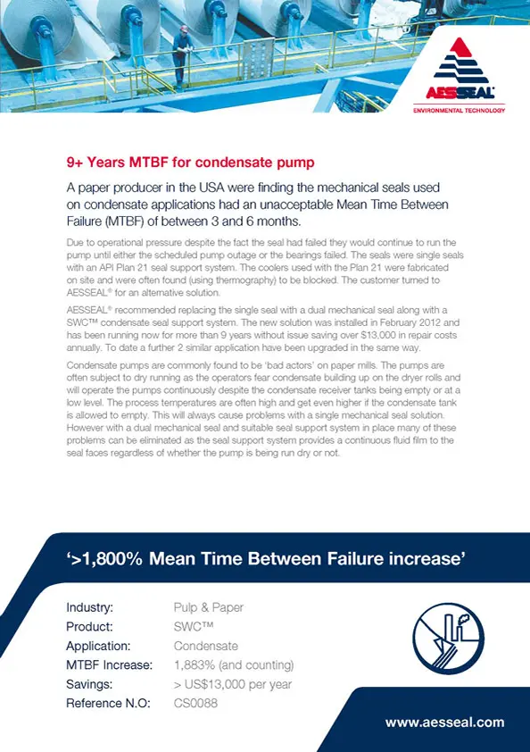 USA Paper producer found mechanical seals used on condensate applications had an unacceptable Mean Time Between Failure.