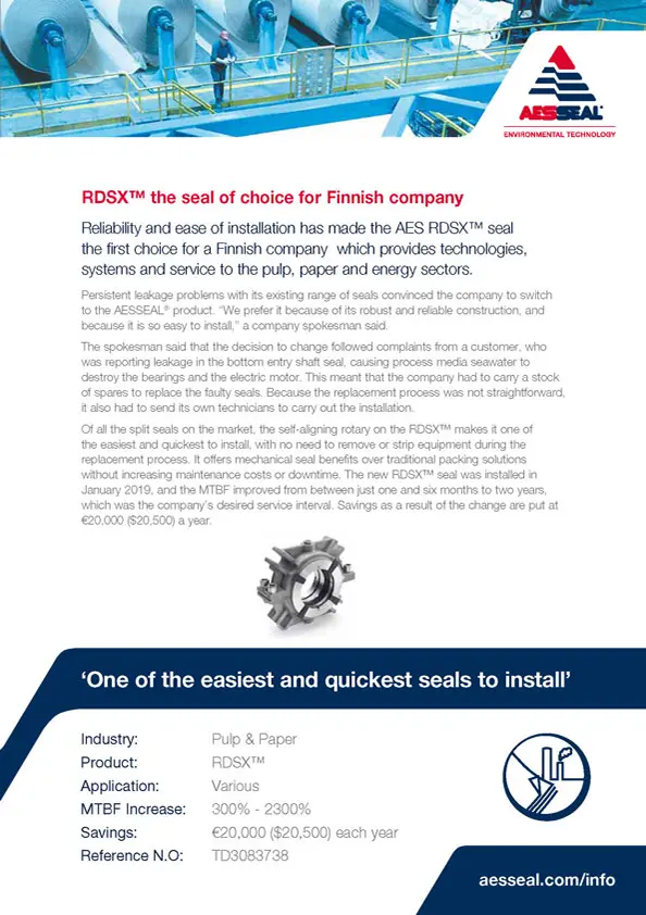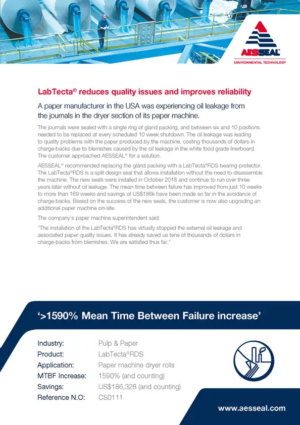 A Kentucky pulp and paper company is saving at least $19,000 a year following the replacement of its existing seals with AESSEAL products.