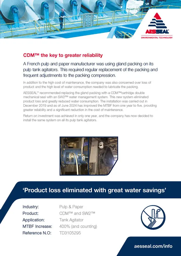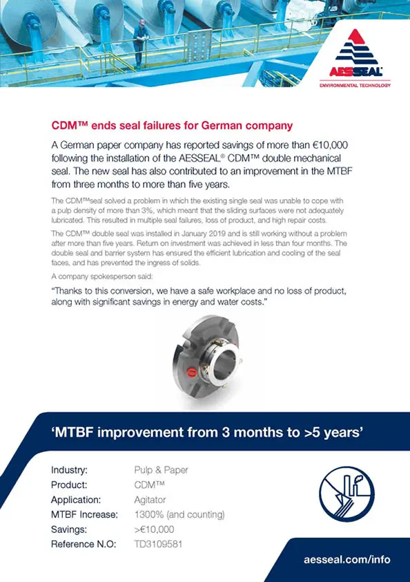 A German paper company has reported savings of more than €10,000 following the installation of the AESSEAL CDM double mechanical seal.