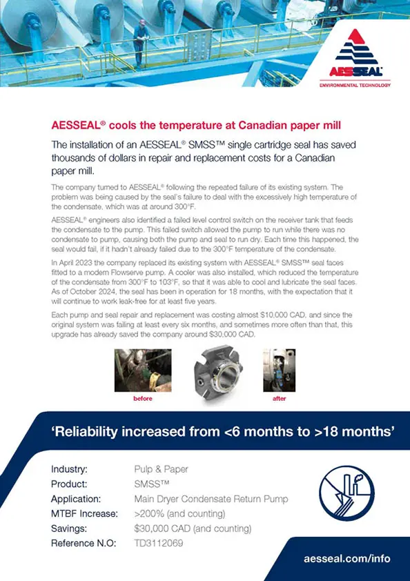 The installation of an AESSEAL SMSS single cartridge seal has saved thousands of dollars in repair and replacement costs for a Canadian paper mill.
