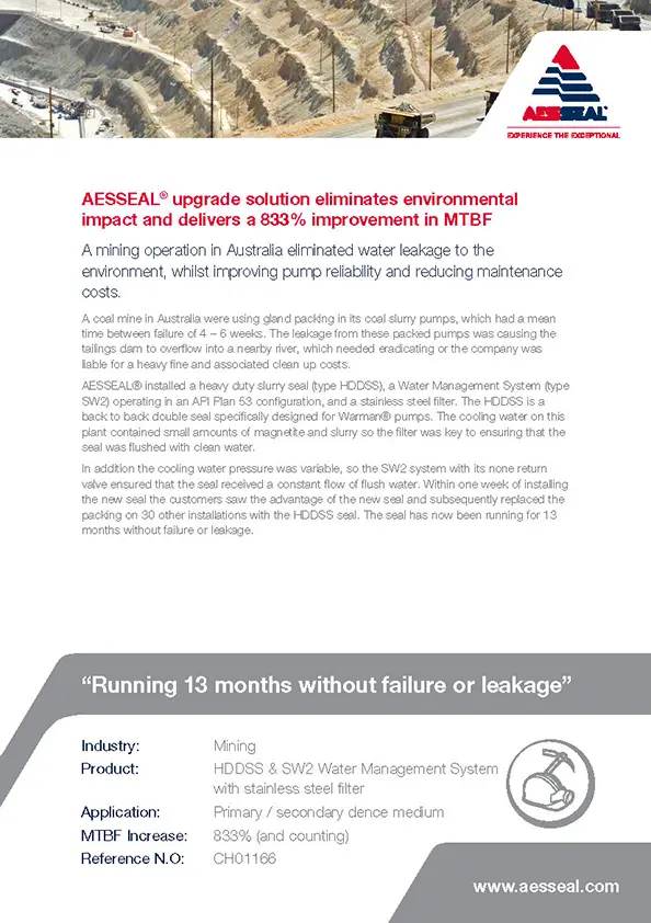 A mining operation in Australia eliminated water leakage to the environment, whilst improving pump reliability and reducing maintenance costs.