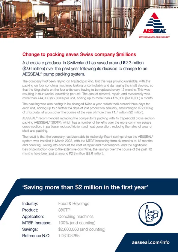 A chocolate producer in Switzerland has saved around ₣2.3 million ($2.6 million) over the past year following its decision to change to an AESSEAL pump packing system.